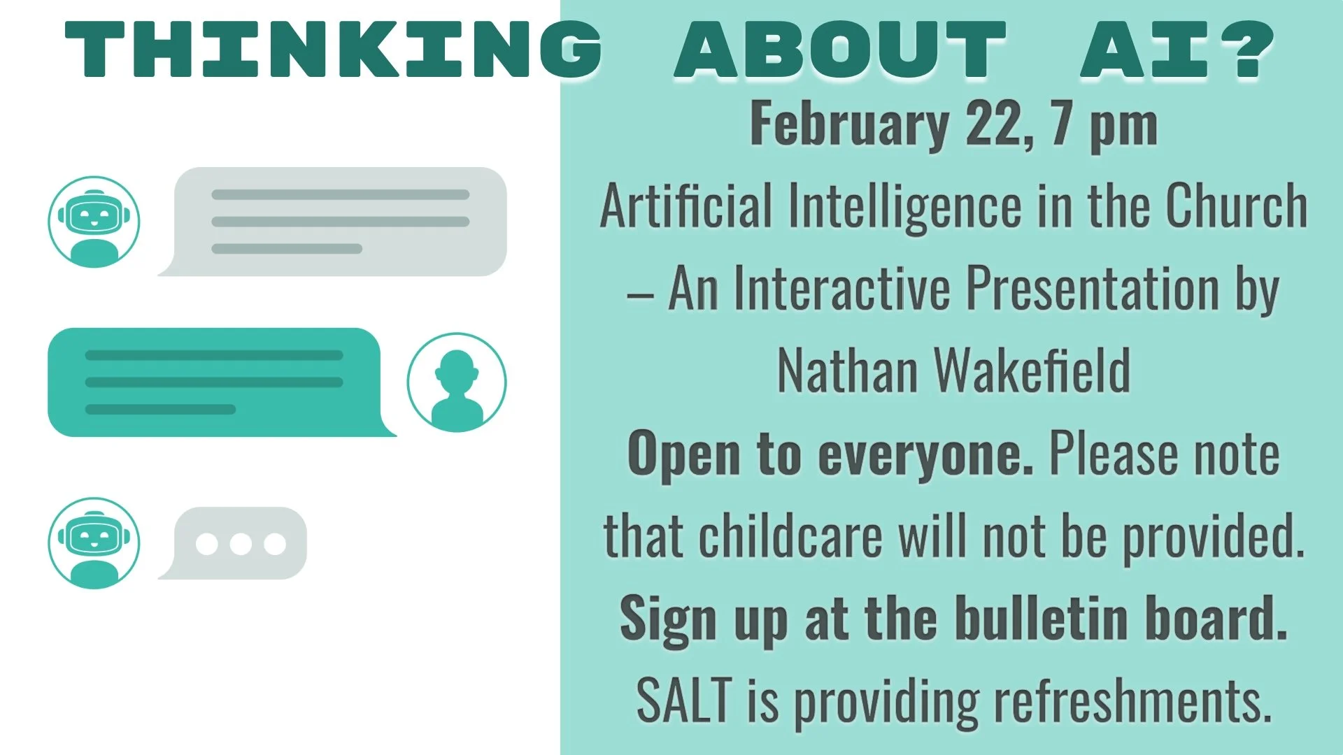 Soups and dessert will be served followed by a time of guided prayer. Sign up on the bulletin board.